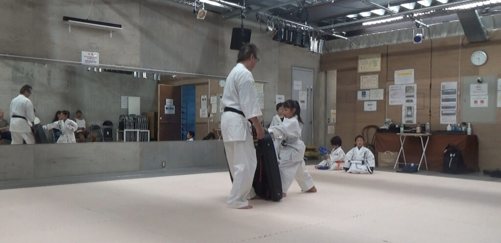難しいかもしれませんが、実際にミットを突きながら「前屈立ち追い突き」を行いました。