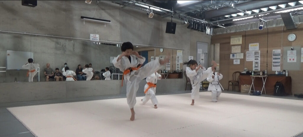 そして蹴りの稽古は、皆で「前蹴上」「前蹴り」「廻し蹴り」の移動稽古を行いました。