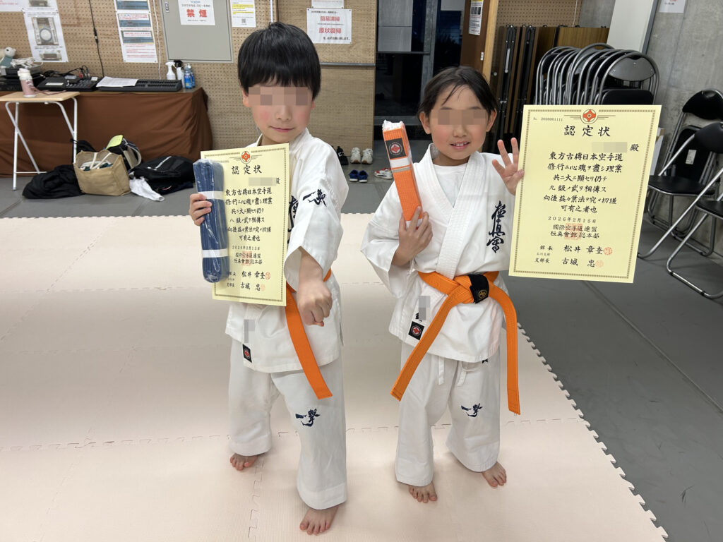 「K平」は8級(青帯)へ「Sちゃん」は9級(橙線あり)になりました。